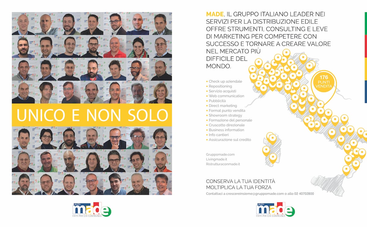 La campagna stampa ci vede presenti su IL COMMERCIO EDILE e YOU TRADE, tutto l’anno, nel format doppia pagina alternato alle pagine singole. Il messaggio è centrato sulla caratteristica dell’adesione a Made che permette al rivenditore di mantenere la propria identità (UNICO) ma, nel contempo, di moltiplicare la propria forza, entrando a far parte del Gruppo italiano (E NON SOLO) con la più ampia e variegata offerta di servizi espressamente dedicati alla Distribuzione Edile.