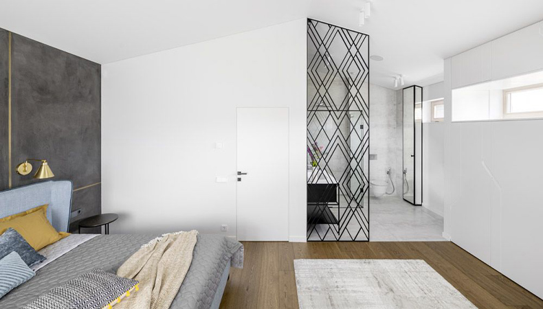 Sul lato opposto della stanza è stato ricavato un bagno dietro una parete di metallo nero traforato con motivi art déco. Dalla vista frontale è ben evidente la sagoma del tetto a spiovente. Il bagno è accuratamente progettato con spazi di contenimento capienti ma sempre discreti: nicchie per i saponi nella doccia e un armadietto a specchio accanto alla toilette.
