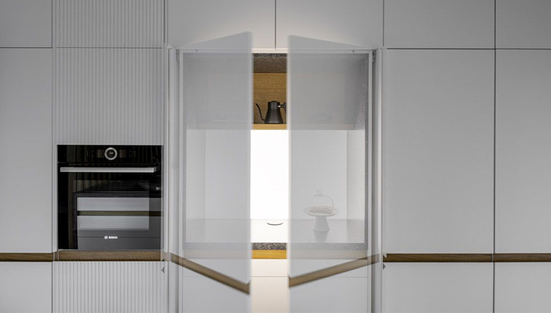 La zona cucina inizia con un pavimento in cemento grigio chiaro. I mobili bianchi, gli elettrodomestici e la cappa con piano cottura integrato aiutano a creare un‘atmosfera di estrema pulizia. Per questa cucina, l’architetto ha progettato due pannelli porta a scomparsa, ideale per riporre i piccoli elettrodomestici di uso quotidiano come il bollitore, lo spremiagrumi e la caffettiera. La parte posteriore della nicchia è retroilluminata, per essere ancora più funzionale.
