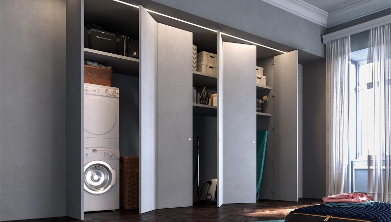 Per non compromettere l’ordine e il look dell’ambiente però, la soluzione migliore è nascondere i vani il più possibile e celarne il contenuto. Sia che ci si trovi di fronte a un intervento di ristrutturazione, sia che si tratti di una nuova costruzione, chiudere una nicchia è un ottimo spunto per contenere elementi quali impianti VMC, quadri elettrici, sistemi d’allarme, tubature, così come lavatrici e asciugatrici.