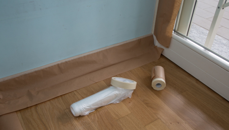 Tra i passaggi non può mancare l’applicazione del nastro adesivo per mascheratura, che ha lo scopo di evitare che il battiscopa e le pareti adiacenti al soffitto si macchino durante la tinteggiatura.