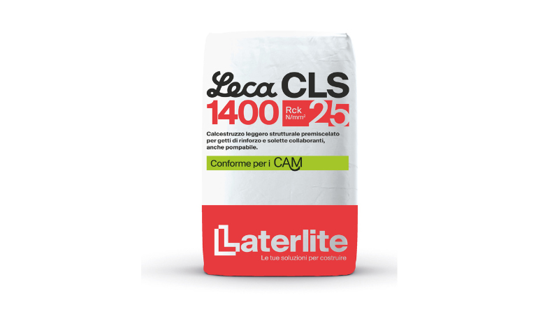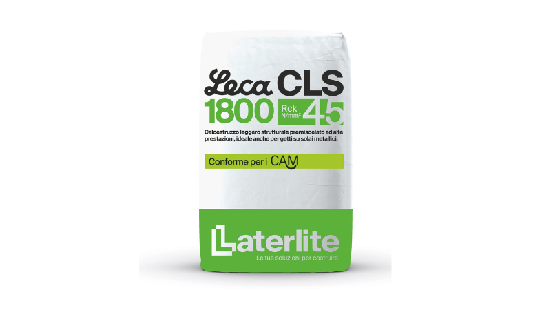 LecaCLS 1800 CAM, infine, è il calcestruzzo leggero strutturale è il calcestruzzo leggero strutturale fibrato premiscelato in sacco ad alta resistenza a base di cemento con alta percentuale di riciclato e basse emissioni di CO2 adatto per la realizzazione di getti di rinforzo su solai in lamiera grecata, o metallici in genere, getti strutturali o elementi prefabbricati.