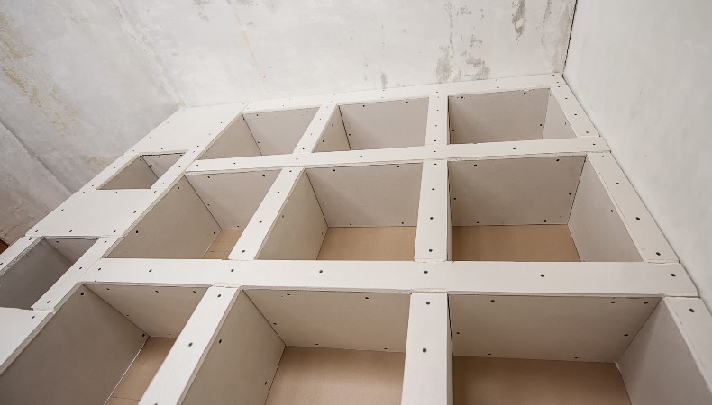Poi si passa all’acquisto dei materiali, a cominciare dai pannelli in cartongesso standard, disponibili in varie misure (90 x 120 cm, 120 x 200 cm e 120 x 300 cm). Serviranno anche viti a tassello, guide e montanti, ripiani in legno.