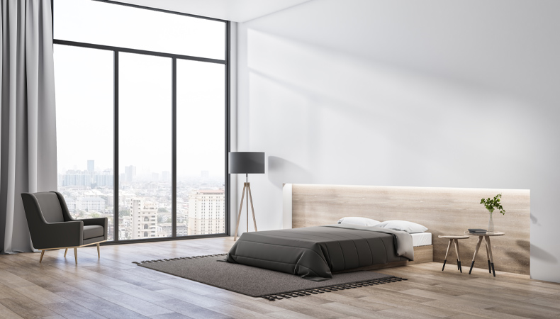 Per continuare sul filo del minimalismo contemporaneo possiamo scegliere pavimenti senza fughe (in resina o in gres con piastrelle rettificate) e una palette neutra e chiara per tende, tappeti, biancheria letto e per gli altri complementi d’arredo.